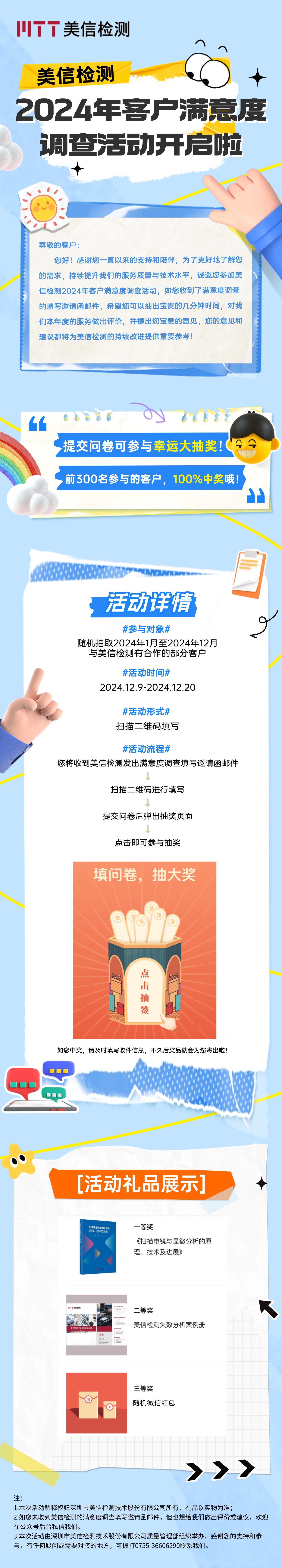 尊敬的客户 您好!感谢您一直以来的支持和陪伴,为了更好地了解您的需求,持续提升我们的服务质量与技术水平,诚邀您参加美信检测2024年客户满意度调查活动,如您收到了满意度调查的填写邀请函邮件,希望您可以抽出宝贵的几分钟时间,对我们本年度的服务做出评价,并提出您宝贵的意见,您的意见和建议都将为美信检测的持续改进提供重要参考!