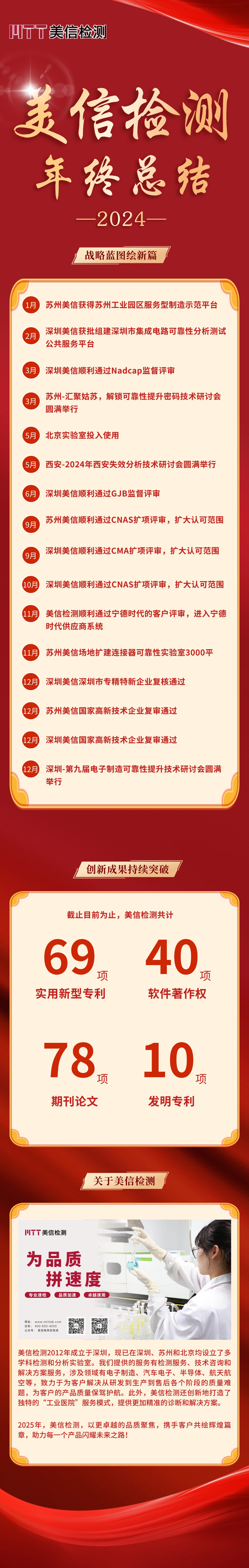 美信检测一家具有国家认可资质的商业第三方实验室 我们专注于为客户提供检测服务、技术咨询服务和解决方案服务,服务行业涉及电子制造、汽车电子、半导体、航空航天材料等领域。