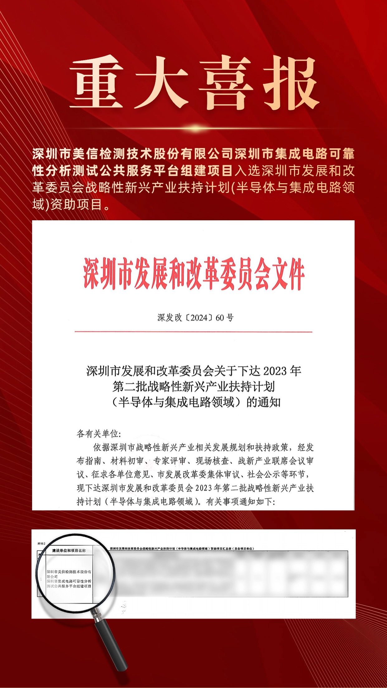 近日,深圳市发展和改革委员会公布《关于下达2023年第二批战略性新兴产业扶持计划(半导体与集成电路领域)的通知》服务机构名单,其中,深圳市美信检测技术股份有限公司(简称:美信检测)深圳市集成电路可靠性分析测试公共服务平台,成功入选该项扶持计划。